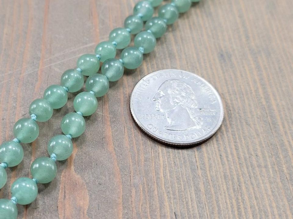 Looking for a simple long necklace? This is it. 45 inches of hand knotted green aventurine beads. Makes a subtle statement but still lightweight and comfortable. It has no clasp, so just put it over your head.