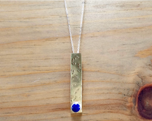 Contemporary lapis lazuli pendant on hammered brass. This narrow vertical bar pendant is a great addition to your layering necklaces. A hidden bail on the back adds interest.
