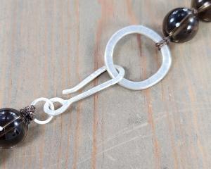 18 inch hand knotted chunky necklace made with 10mm smooth round brown smoky quartz beads. The clasp is a hand made sterling silver hook clasp with a hammered textured finish. Hand knotting gives the necklace a nice drape and adds durability and a unique look.