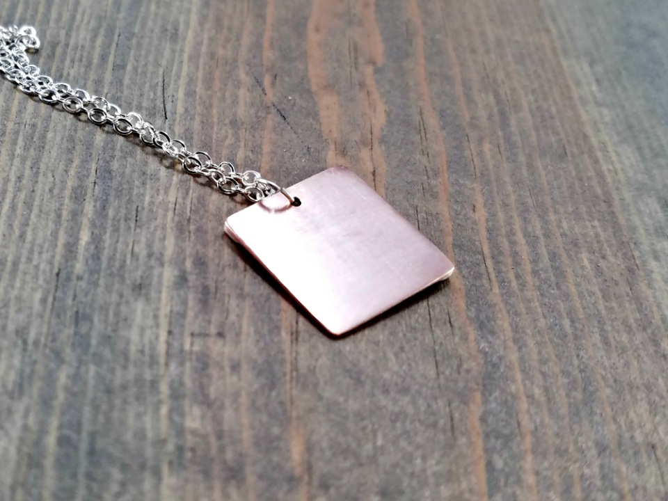 This minimal color block square copper pendant had a geometric flag motif with a diagonal sterling silver stripe. Simple, clean and modern mixed metal copper jewelry.